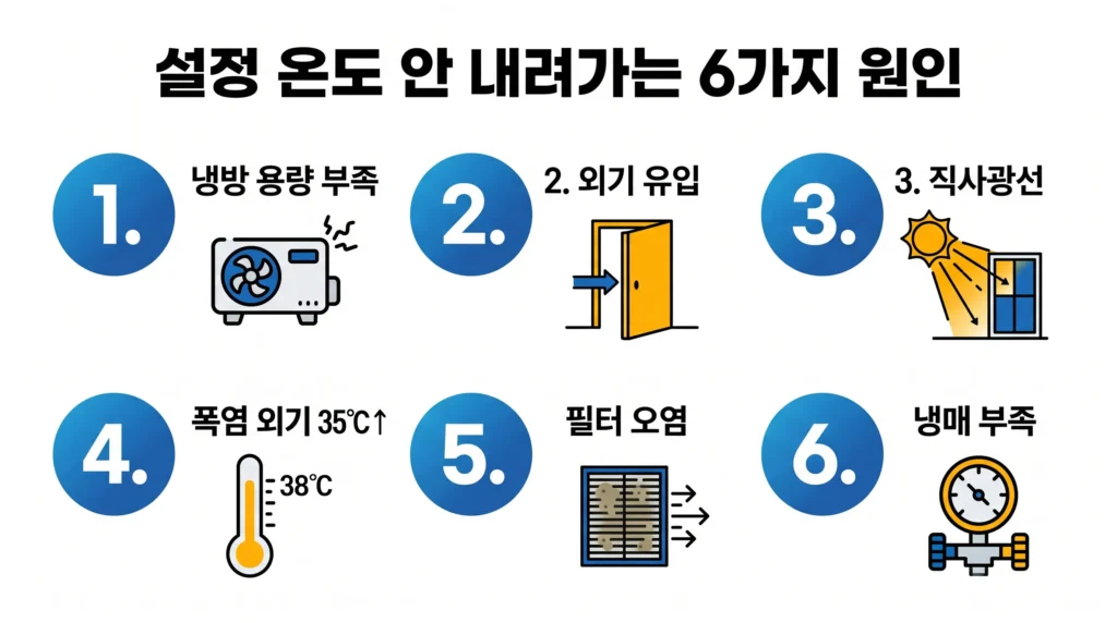 에어컨 설정 온도까지 안 내려가는 원인은 용량 부족, 밀폐 불량, 직사광선 유입, 폭염 외기, 필터 오염, 냉매 부족 6가지예요. 냉방 공간 밀폐, 차광, 실외기 통풍 개선으로 환경 요인을 먼저 제거하고, 이후에도 개선 없으면 전문 AS를 통해 냉매와 컴프레서를 점검해야 해요.
