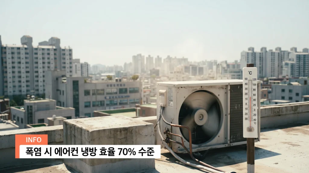 근데 이게 좀 웃긴 게요. 폭염으로 외기 온도가 38℃가 넘는 날에는 에어컨 사양 기준 냉방 성능이 급격히 떨어져요. 한국전기연구원 2024년 자료에 따르면 외기 35℃ 초과 시 일반 에어컨의 실제 냉방 효율은 정격 대비 70~80% 수준으로 떨어질 수 있어요.