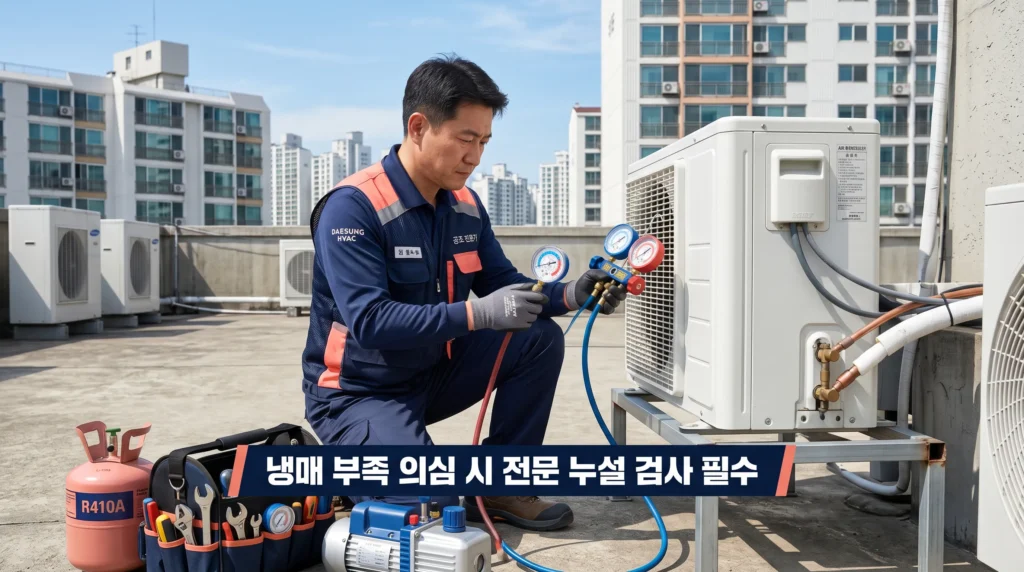 ✅ 냉매 누설은 단순 충전으로 해결 안 됨 — 누설 부위 수리 후 충전이 원칙이에요.