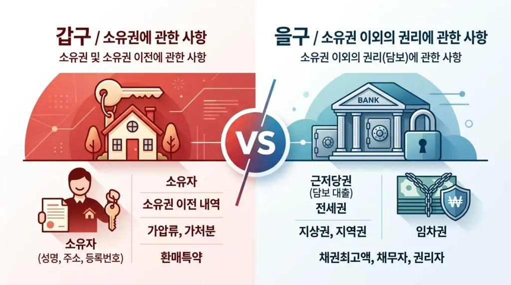 갑구는 “이 집 주인이 누구인지”, 을구는 “이 집에 빚이 얼마나 걸려 있는지”를 보여주는 칸이에요.