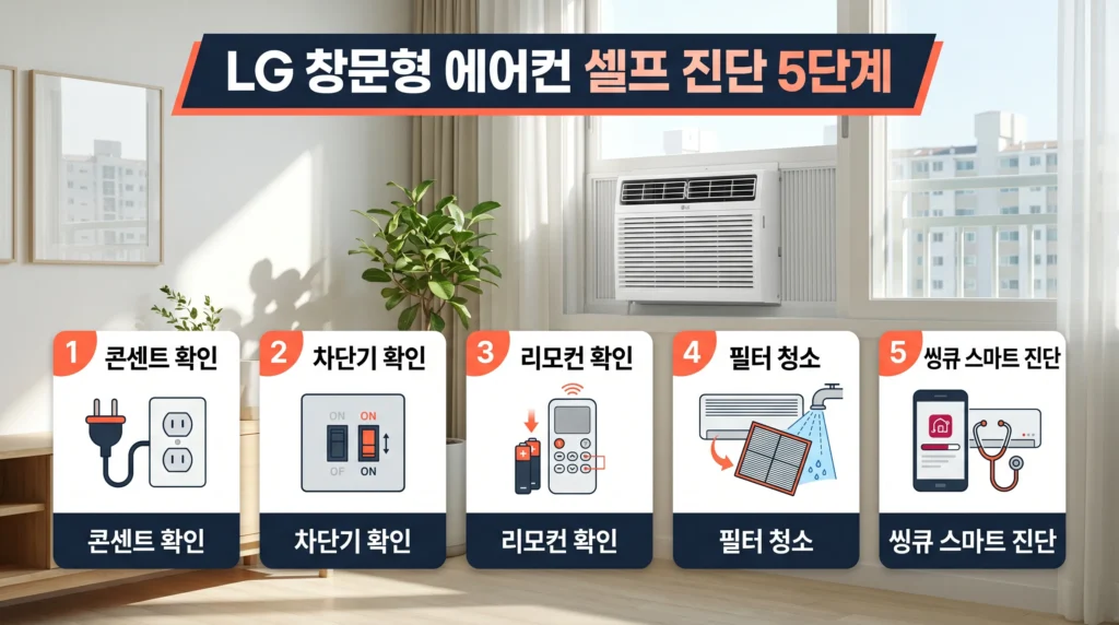 LG 창문형 에어컨 냉방 약할 때는 콘센트·차단기 → 리모컨 → 필터 청소 → 창문 밀폐 → LG 씽큐 스마트 진단 순서로 셀프 점검하면 돼요. 스마트 진단으로 냉매·컴프레서까지 1분 안에 체크 가능하고, 진단 결과에 따라 셀프 해결 또는 AS 신청 여부를 결정하면 돼요.