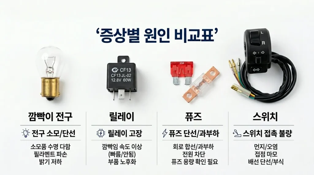 솔직히 이건 모르면 손해예요. 전구·릴레이·퓨즈를 모두 교체했는데도 증상이 반복된다면, 핸들바 스위치 내부 접촉 불량을 봐야 해요.