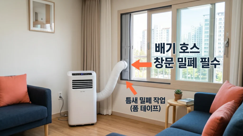 이거 의외로 모르는 분이 많더라고요. 이동식 에어컨의 배기 호스가 창문 밖으로 나가더라도, 호스 주변 창문 틈이 막혀 있지 않으면 뜨거운 공기가 그 틈새로 다시 실내에 유입돼요.