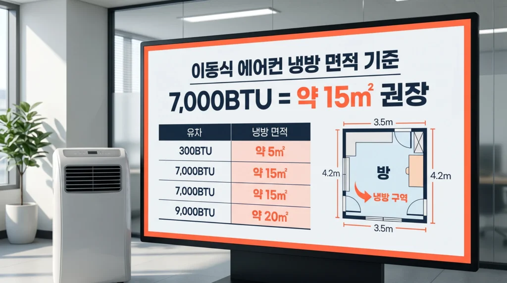 예를 들어 7,000BTU 제품이면 약 20㎡(6평) 정도까지 커버하는데, 이동식 에어컨은 효율 손실이 크기 때문에 실제로는 15㎡(4.5평) 이하 공간에서 가장 효과적이에요. 문을 닫아 냉방 공간을 최대한 좁혀주는 것도 중요해요.